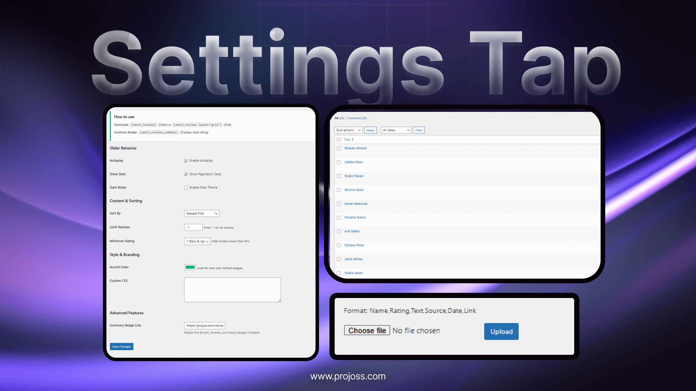 To keep the plugin lightweight, affordable (no monthly fees), and fast, this plugin is designed for Manual Entry and CSV Import. This gives you 100% control over which reviews appear on your site—no negative spam reviews will ever show up automatically.